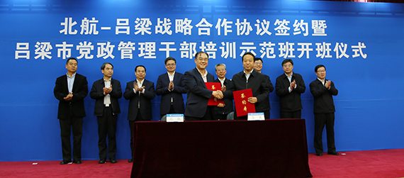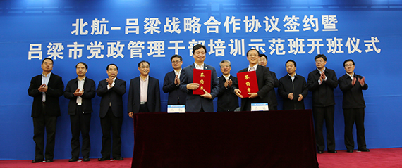 北航新闻网4月15日电(记者孙也程)4月15日上午,北航-吕梁战略合作协议签约暨市党政管理干部培训示范班开班仪式在如心会议中心大报告厅举行。吕梁市委书记李正印、市长王立伟、副市长杨巨才、市人民政府秘书长梁斌,中阳县委书记乔晓峰、县长田安平,以及我校党委书记张军院士,副校长魏志敏,党委副书记程基伟、李军锋等出席了签约暨开班仪式。仪式由程基伟副书记主持。
