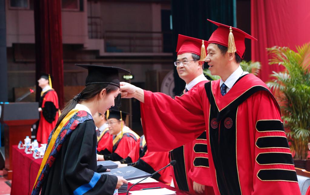 党委书记张军院士为毕业生代表颁发毕业证书和学位证书,校长徐惠彬院士为毕业生代表授予学位。