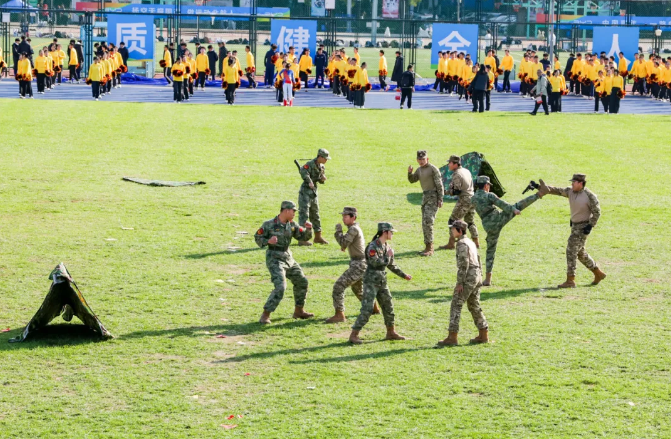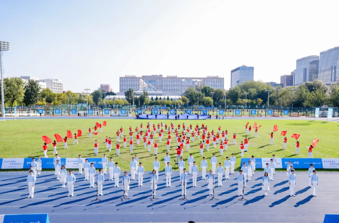 体育为骨,文艺注魂。1300余名师生共同呈现了精彩纷呈的体育文艺展演,展示北航体育文化建设丰硕成果,为这场体育盛会锦上添花。旗展山河,武动少年意气;龙腾云海,尽显华夏神韵,600余名北航学子以旗为笔绘乾坤,以拳为墨书正气,展现着中国传统体育文化的独特魅力;利刃出鞘、拳拳生风,北航猎鹰突击队战士奋楫向前,用战术动作呈现烽火岁月,用青春热血致敬英雄旗帜;逐梦苍穹,活力启航,与啦啦操队员们一起,由北航机械学院空间机器人实验室、北航具身智能机器人研究院和北航机器人队共同研制的四足机器人等机器人亮相操场。舞步轻盈、动感十足,随着音乐节奏,共同演绎别样的浪漫;乐声磅礴、歌声激昂,参与纪念中国人民抗日战争暨世界反法西斯战争胜利80周年大会广场合唱团成员代表与北航行进管乐团,共同演绎乐曲《请你检阅》,牢记使命、踔厉奋发,用歌声穿越历史长河,唱响对祖国的深情礼赞。