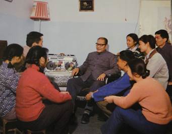 林士谔与研究室师生讨论液浮陀螺工作(右1为林士谔)